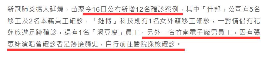 因为现场聚集了大批粉丝,所以张惠妹演唱会现场也不可避免地连续多日出现确诊人数,据台媒15日的报道中得知,现场观众确诊的人数已飙升至22人,而在16日中,再有一名电子厂员工因观看张惠妹演唱会确诊,截止16日共计确诊人数已飙升到23人。