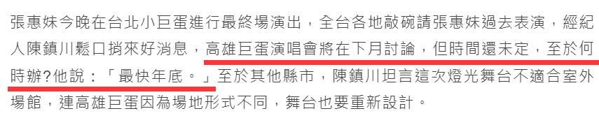 据悉,张惠妹举办完小巨蛋演唱会后,接下来还会在高雄巨蛋举行演唱会,而相关事宜下个月讨论,经纪人透露最快也要年底了,因为场地的不同舞台也要重新设计等。