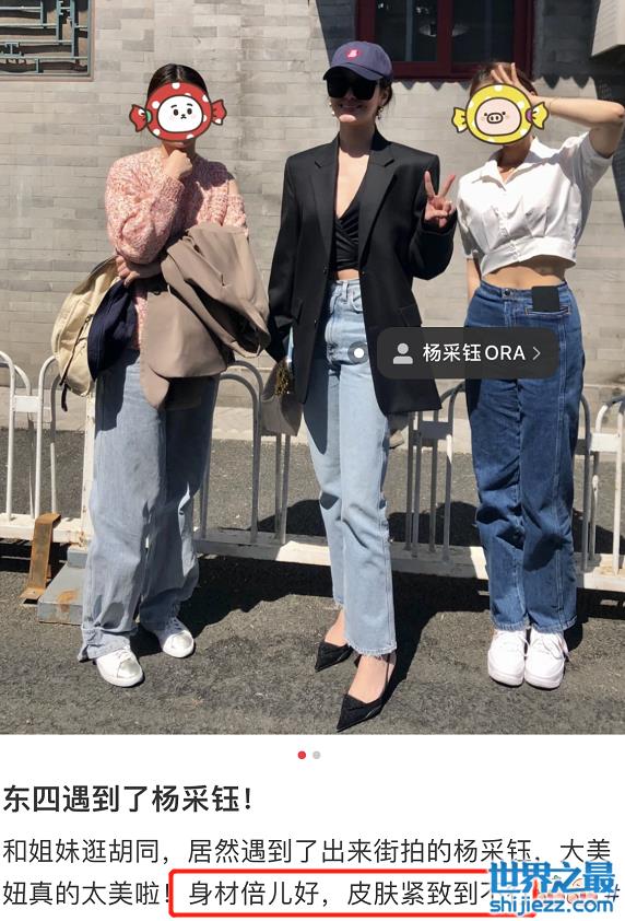 近日,有网友在社交平台上晒出了在某胡同偶遇杨采钰的照片,引发了广大网友的关注。照片中,杨采钰举手比耶站在两名路人中间,气质十分出挑,偶遇的网友也夸赞杨采钰皮肤紧致身材超好。