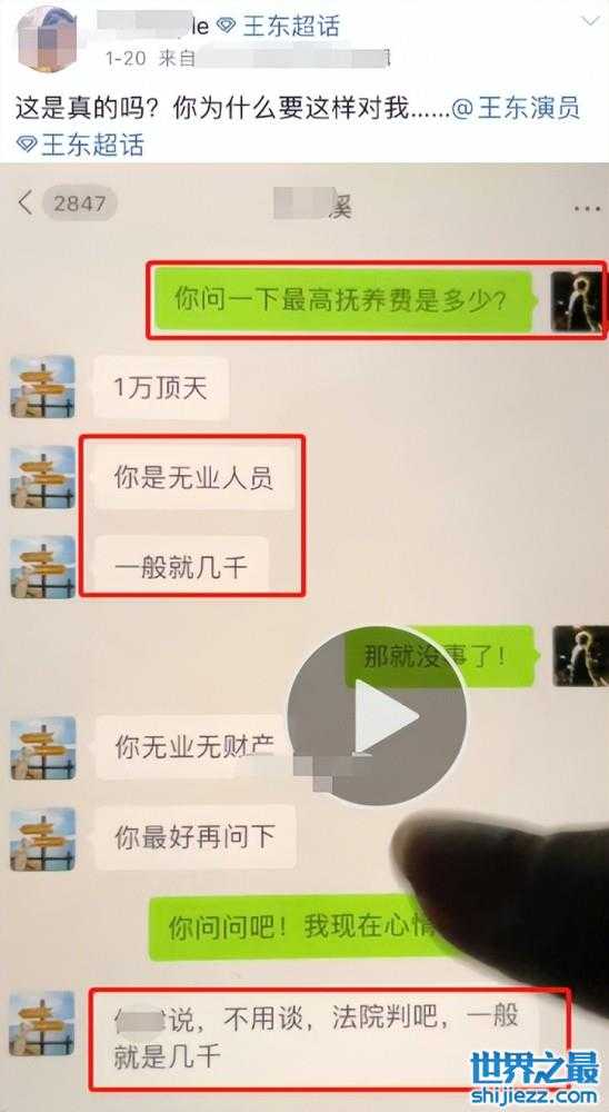 此外,王东妻子还晒出了王东疑曾向好友询问离婚抚养费的问题,得知因为自己是无业人员,一个月顶天一万之后表示没事了。