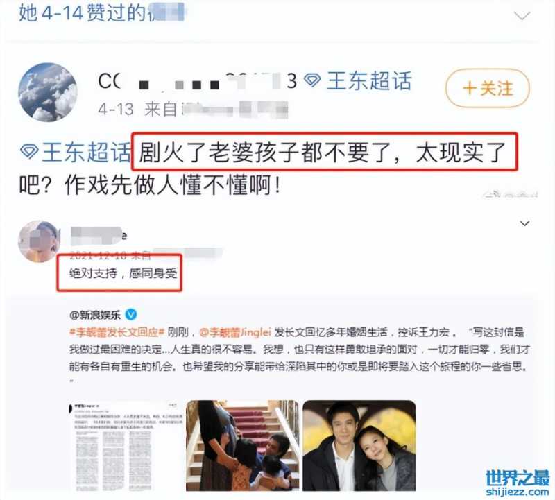 王东妻子还点赞了他人批评王东“剧火了抛弃老婆孩子”的批评言论,并一直在跟进王力宏李靓蕾离婚案,强调自己“绝对支持女方,感同身受”,被网友猜测她或许在婚姻里也是被辜负的角色。