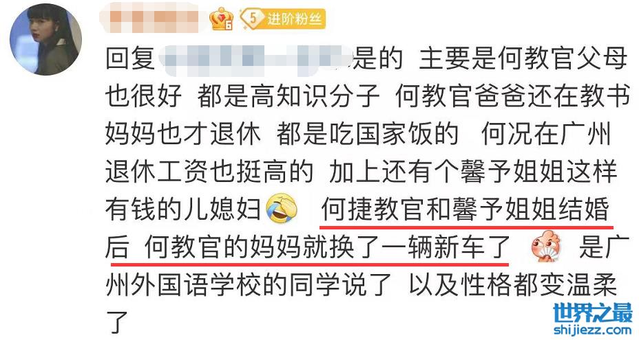 除此之外,这位粉丝还讲述了有关何捷的家庭情况,其中提到何捷的父母都是高知识分子,何爸爸目前还在指挥学院当教授,何妈妈早年是广州外国语学校的校医,在那个年代还是为数不多的大学本科生,何妈妈虽然当下已经退休,但每个月都领取不菲的退休工资,何捷与张馨予结婚之后,何妈妈便换了一辆新车,估计也是儿子儿媳特意为其出资购置的特别礼物。