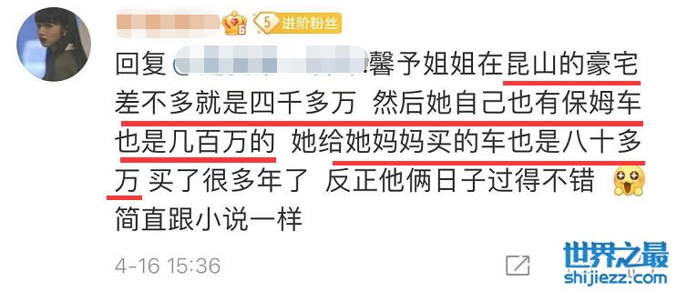 另外,该粉丝还透露,张馨予在昆山老家为母亲购置的豪宅价格大约为四千多万,自己使用的保姆车也市值几百万,除此之外,孝顺的张馨予还为母亲购置了私人座驾,价格也高达80余万。