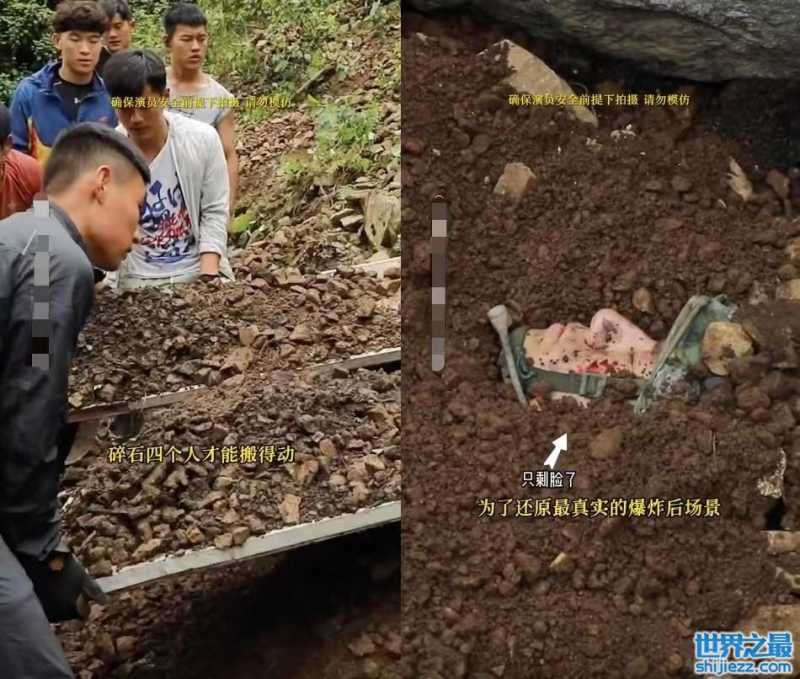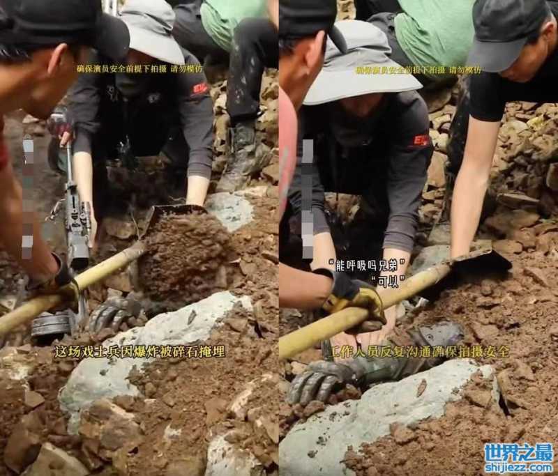 这样拼命也伴随着一定的风险,这些碎石要四位工作人员合力才能抬得动,可见其重量。郭洺宇事先已经被埋在了泥土中等待导演一声令下,这些碎石就会压在他身上。而为了演出爆破的效果,郭洺宇只露了半边脸和一只手,鼻子也有一半埋在了土里。