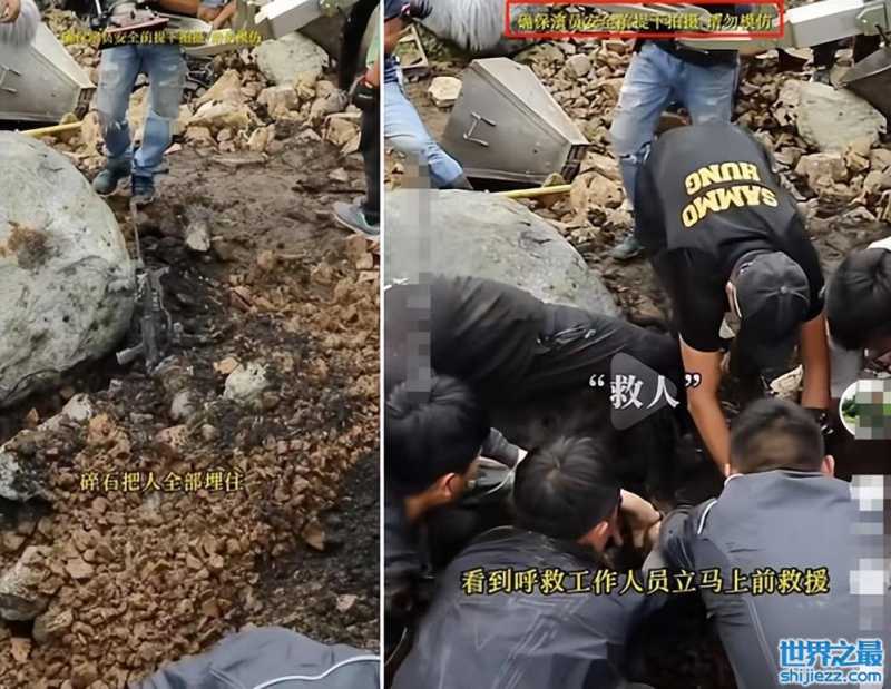 或许是这些碎石重量太大,郭洺宇被压住没过几秒就开始用手拍地,表示身体出现不适急需救援。看到郭洺宇呼救,工作人员紧急将其拉出,挖了好几下才把郭洺宇拉出来。