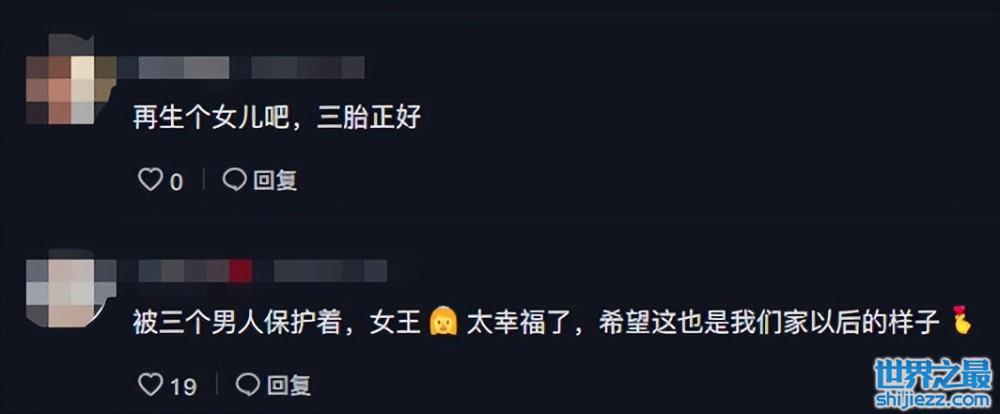 看见一家人如此的温馨打闹的画面,网友们纷纷评论说,要陈龙一家再生个女儿,说是三胎正好。还有的说陈龙老婆太幸福了,被三个男人保护着,并希望自己以后像他家一样。
