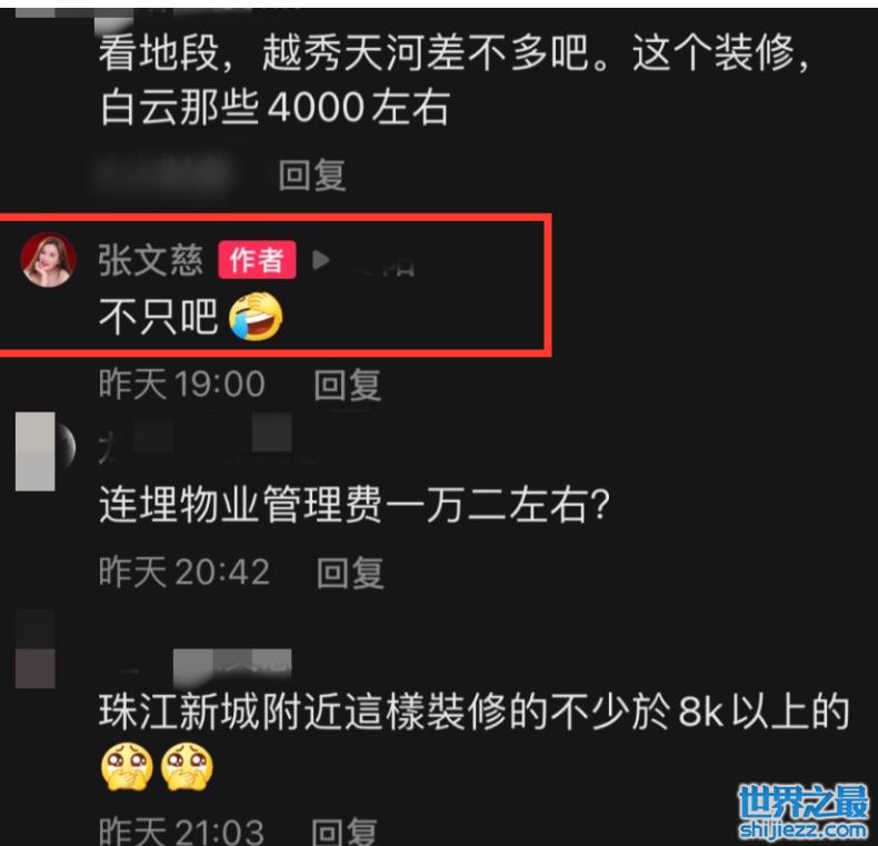 张文慈还跟大家分享了在广州租的房子,面积和装修看起来都相对普通,一开始有网友猜测月租要4千元左右,但张文慈回复“不止”,后来有网友根据窗外的景色推测房子可能位于繁华路段,租金可能在1万左右。