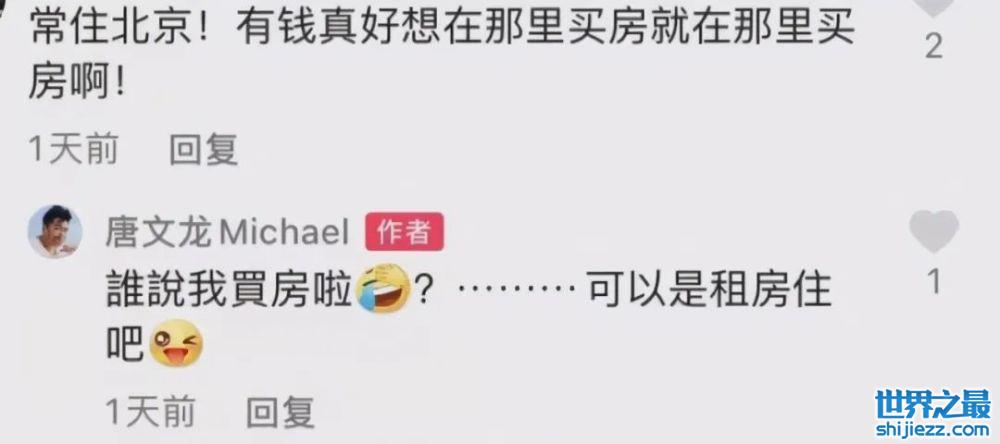 曾有网友评论说羡慕唐文龙有钱真好,想在哪里住就可以在哪里买房。唐文龙则回复,房子不一定是买的,可以是租的。唐文龙此番回应疑似否认在北京买房,看来对于不是当红的一线明星,在一线城市买房子也是有压力的。