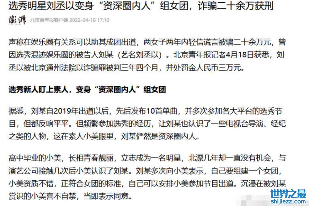 在详细的官方报道中得知,刘丞以凭借着自己曾多次参加选秀的经历,直接讹骗对方自己是“资深圈内人士”,并让对方相信自己认识不少电视台的导演和经纪人,以组建女团为由,让对方深信不疑。