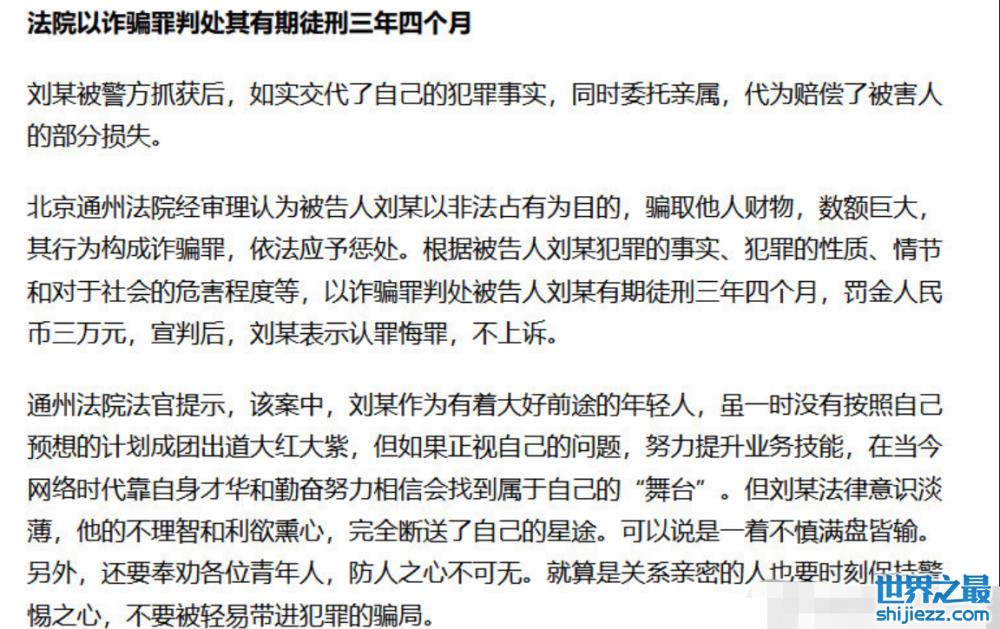 在事情曝光之后,刘丞以如实交代了自己的骗人事实,并且委托了自己的亲属赔偿了受害人的部分损失,目前刘丞以已经被3年6个月的有期徒刑并且处罚人民币3万。