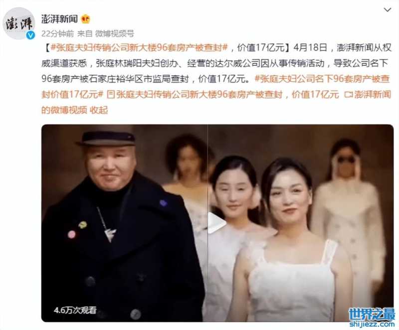 4月18日,官方媒体公开消息,张庭林瑞阳夫妇创办、经营的达尔威公司因从事传销活动,导致公司名下96套房产被石家庄裕华区市监局查封,价值17亿元。