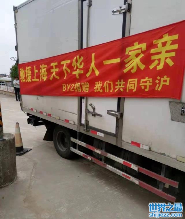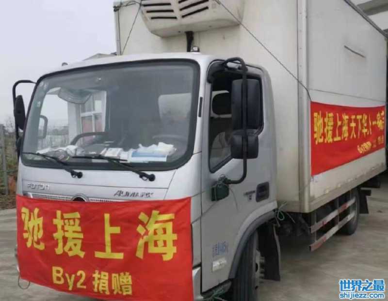而在4月18日,有网友爆料称By2姐妹组合也为上海高校捐赠了物资,两人在所装物资的货车上还拉着条幅,写着“天下华人一家亲”“共同守沪”等暖心标语,最后还备注上了by2捐赠。