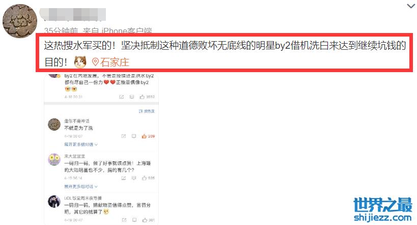 还有一部分网友质疑在没有证实真捐假捐就上了热搜,怀疑是By2团队买的热搜,评论区也都是清一色的好评,还有网友质疑By2是在作秀,就是想利用公益洗白自己,还吐槽啥时候捐款成艺人挡箭牌了。