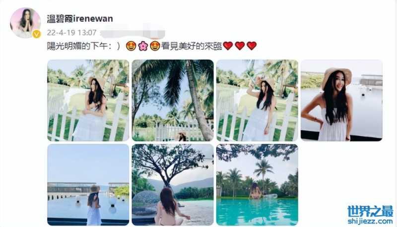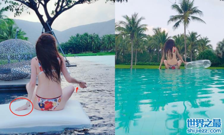 而在另两张图片中温碧霞身穿极具热带色彩的比基尼,大胆向大众展示仍旧白皙完美的身材。她顶着半湿卷发慵懒地坐在白色气垫上,悠然地欣赏着对岸的风景。同时也无意中秀出她戴着的两个手镯和几个闪亮的戒指。