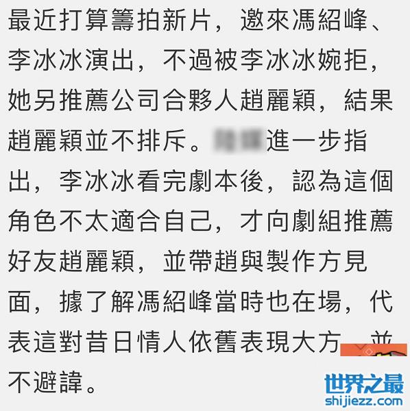 除此之外,有消息称某电影公司准备筹拍新片,拟邀请冯绍峰与李冰冰倾情出演,而李冰冰在看完剧本之后,认为自己并不适合这个角色,便婉拒了片方的邀请。不过事后李冰冰还主动为片组物色人选,推荐了公司合伙人赵丽颖。
