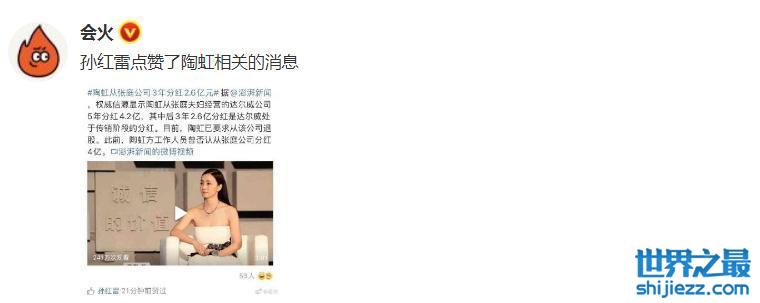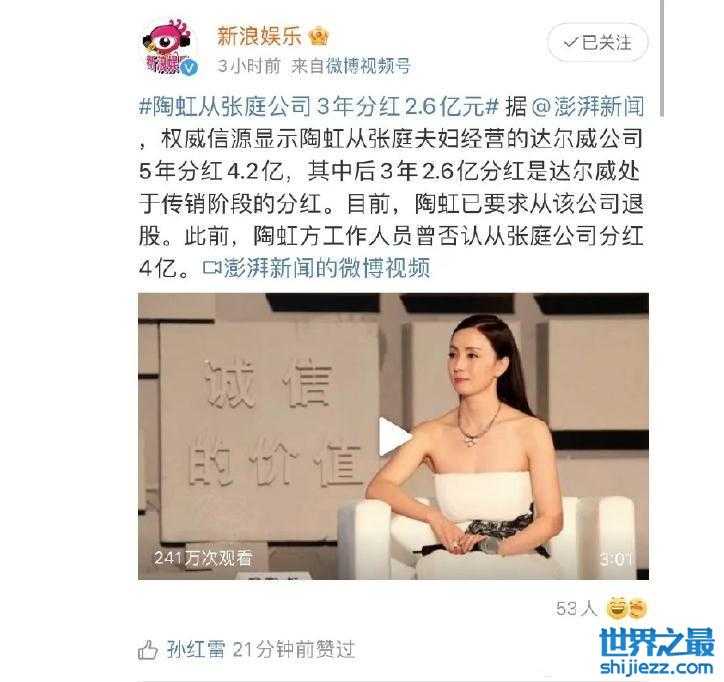 陶虹为什么被官方的数据公开,原因就是因为她曾经也是张庭母公司的合伙人,并且获得了数亿的分红。