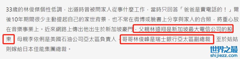 之前还有媒体报道,林俊杰一大家子都是“来头不小”,爸爸是国外某大型公司股东之一,妈妈是某石油公司负责人,哥哥则是国外银行亚太区副总裁,姑姑也是知名公司的集团总裁,听起来就像是小说中虚拟出来的精英家庭。