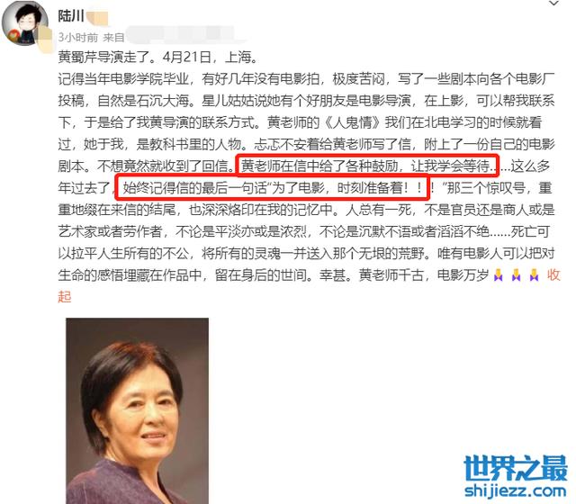 导演陆川也发长文悼念黄蜀芹导演,并分享了一些自己和黄蜀芹导演过去的互动。在自己事业低迷的时刻,陆川心怀忐忑地给黄蜀芹导演写去了信,黄蜀芹导演给了他很多鼓励,并写了这样一句让人印象深刻的话,那便是“为了电影,时刻准备着”,相信这也是黄蜀芹导演人生的信条。