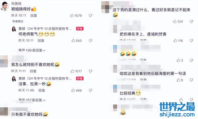 曹颖发出这条视频后,何晟铭也是第一时间到评论区留下评论说颖姐跳得好,曹颖也是立马回复说何老师客气了,两人间的互动十分有爱。还有网友说何晟铭看起来好眼熟啊,但忘记他曾经出演过什么角色了,也是立马有网友说出了他的代表作《宫》。