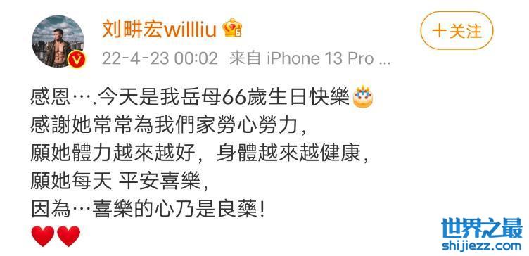 刘畊宏发文:感恩,今天是我岳母的66岁,生日快乐。感谢她常常为我们家劳心劳力,愿她的体力越来越好,身体越来越健康,愿她每天都平安喜乐,因为,喜乐的心是良药。