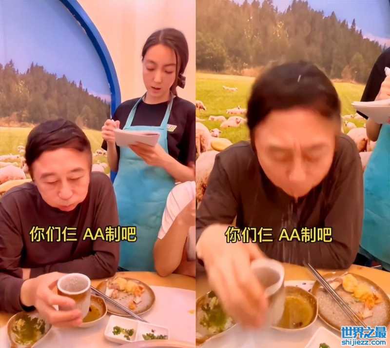 所以最后的服务员直接来了一句,三个人aa。当时的冯巩正喝完一口水,还没咽下去,就被服务员的这句话吓到,嘴里的一口水直接喷了出来,洒在了桌子上。喷完水之后,感觉有些不妙,接着拿手捂住了自己的嘴。