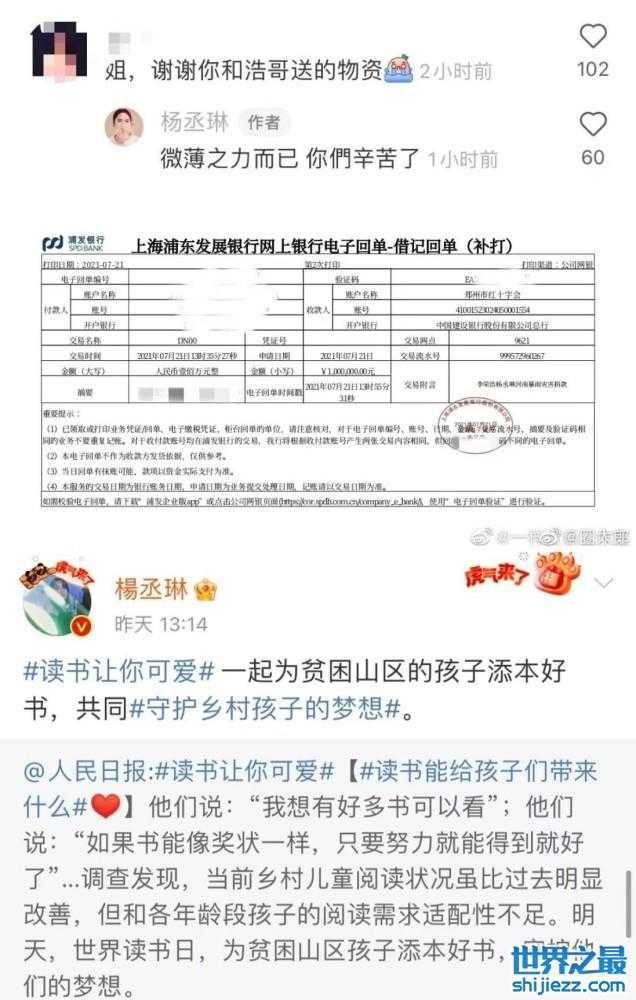 同时网友在评论中感谢杨丞琳李荣浩夫妇送去的物资,杨丞琳回复道“微薄之力而已,你们辛苦了。”据了解杨丞琳夫妇为上海人民送去了米面粮油物资,十分暖心。除此之外,二人也致力于慈善事业。杨丞琳曾为河南捐款一百万、守护山区孩子梦想等,二人都默默无闻地付出着。
