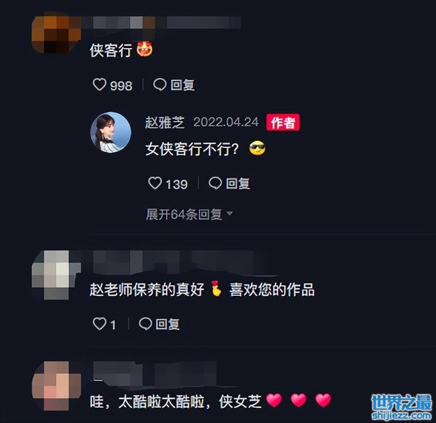 网友们看见这样的赵雅芝,纷纷在底下漂亮留言。有的评论她这个视频就是侠客行,赵雅芝还在下面亲切地回应说女侠客行不行。这还用问,当然可以。还有的在夸赞赵雅芝老师保养得很好,还是跟以前一样,像个少女。