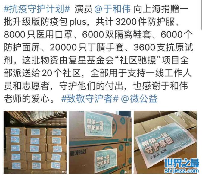 同样毕业于上海戏剧学院的于和伟,对上海这个地方也有感情,他向在上海的一线工作人员捐赠了升级版防疫包,帮助了20个社区。