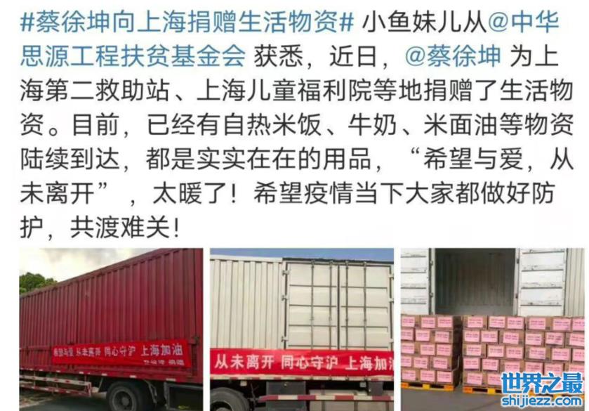 蔡徐坤为上海第二救助站、上海儿童福利院捐赠了生活物资,自热米饭、牛奶、食用油等实用品,都已经通过卡车运输,到了需要的人手里。