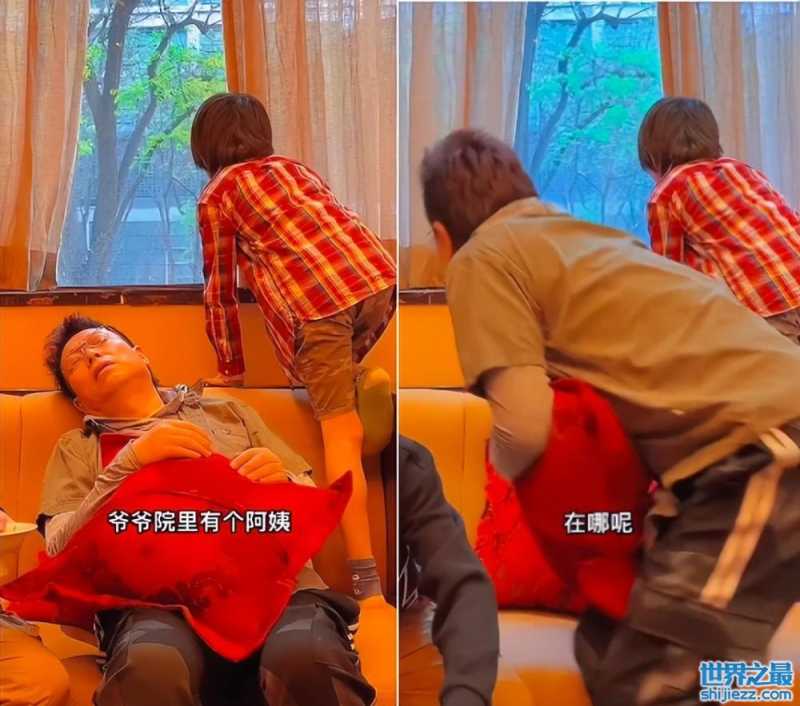 最后还是小孙子比较有办法,只见小家伙爬到了沙发上,朝着窗外就开始喊外面有个阿姨。王为念一听一下就从沙发上爬起来,两爷孙一起跪在沙发上往外张望,嘴里还说着哪里有阿姨。看起来还是小孙子比较了解爷爷。