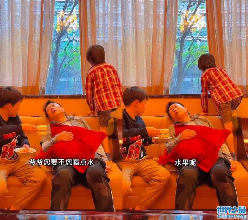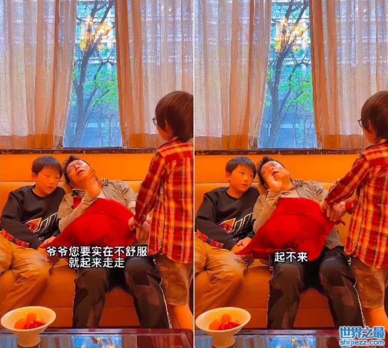 大孙子看见爷爷躺在沙发上很是担心,端着桌子上的水杯和水果准备给爷爷王为念吃点。看起来很有孝心,是真的担心爷爷的安危。而王为念既不喝茶也不吃水果,只是抱着枕头瘫坐在沙发上。