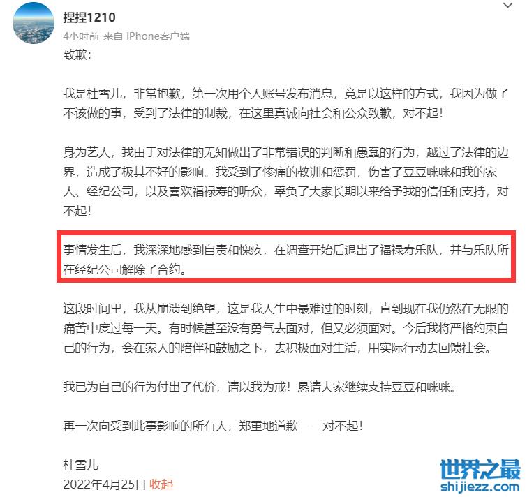 事情曝光后,杜雪儿本人就所犯之事公开道歉,她表示身为艺人由于无知做出了非常错误的判断和愚蠢的行为,越过了法律的边界,造成了极其不好的影响,她已深深地感到自责和愧疚,目前杜雪儿已退出了福禄寿乐队,并与乐队所在经纪公司解除了合约,也因为自己的行为伤害了另外两位成员豆豆咪咪,也恳请大家继续支持豆豆和咪咪。