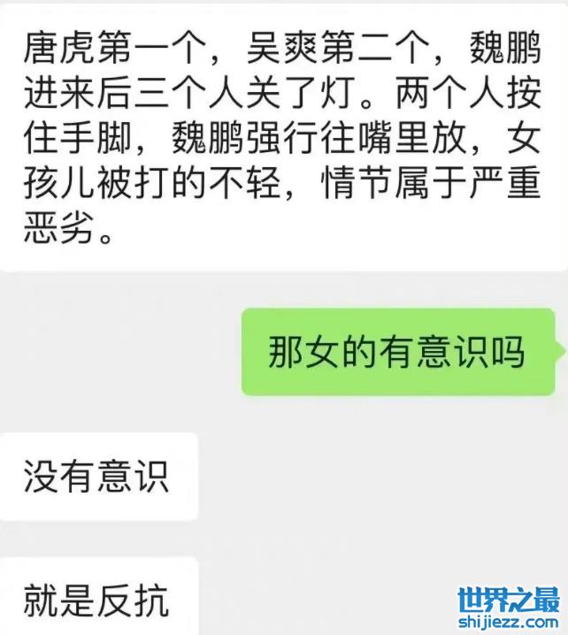 据说是魏鹏与其他两名男子性侵一女生,其中一位男子是知名配音演员唐虎,另一名叫吴爽。期间该女生曾反抗,但却遭到暴力殴打。