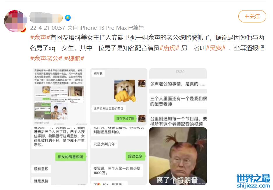 但没想到,近日网上却曝出余声丈夫魏鹏涉嫌参与多人性侵,疑似被警方逮捕。