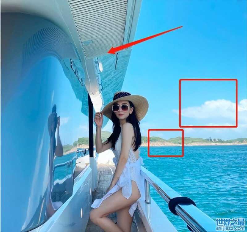 从图片中我们看到方媛拍照的周围环境优美,豪华游艇停靠在海岸边,远处群山围绕显得高级优雅。天气晴朗还有云朵漂浮,画面中美丽的方媛与景色都让人眼前一亮。