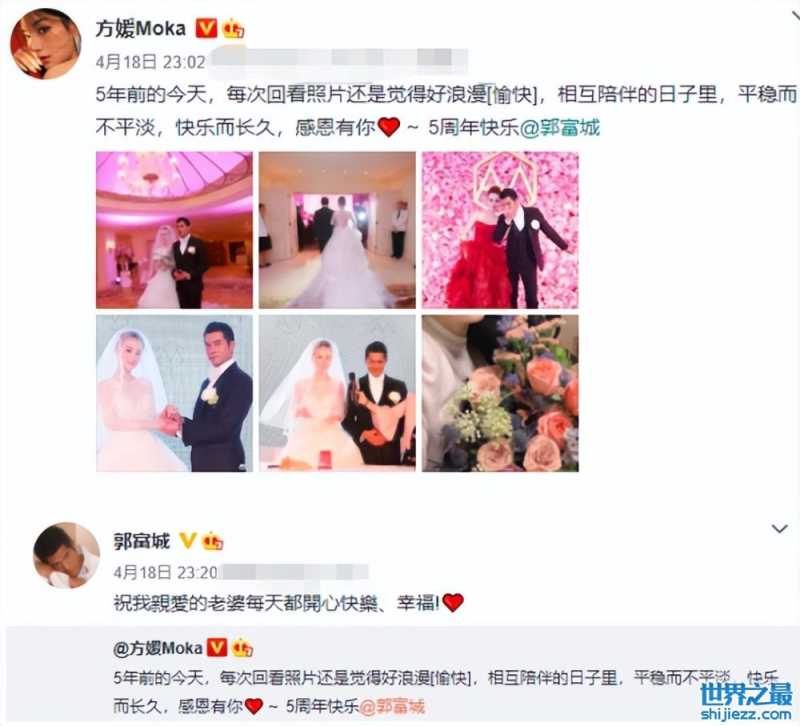 在4月18日两人结婚五周年纪念日时,方媛在社交平台晒出两人的结婚照,配文平稳浪漫。而郭富城也贴心回复希望老婆方媛每天开心幸福,两人互动爱意满满。虽然结婚五年,但两人对彼此的爱也越来越深沉。