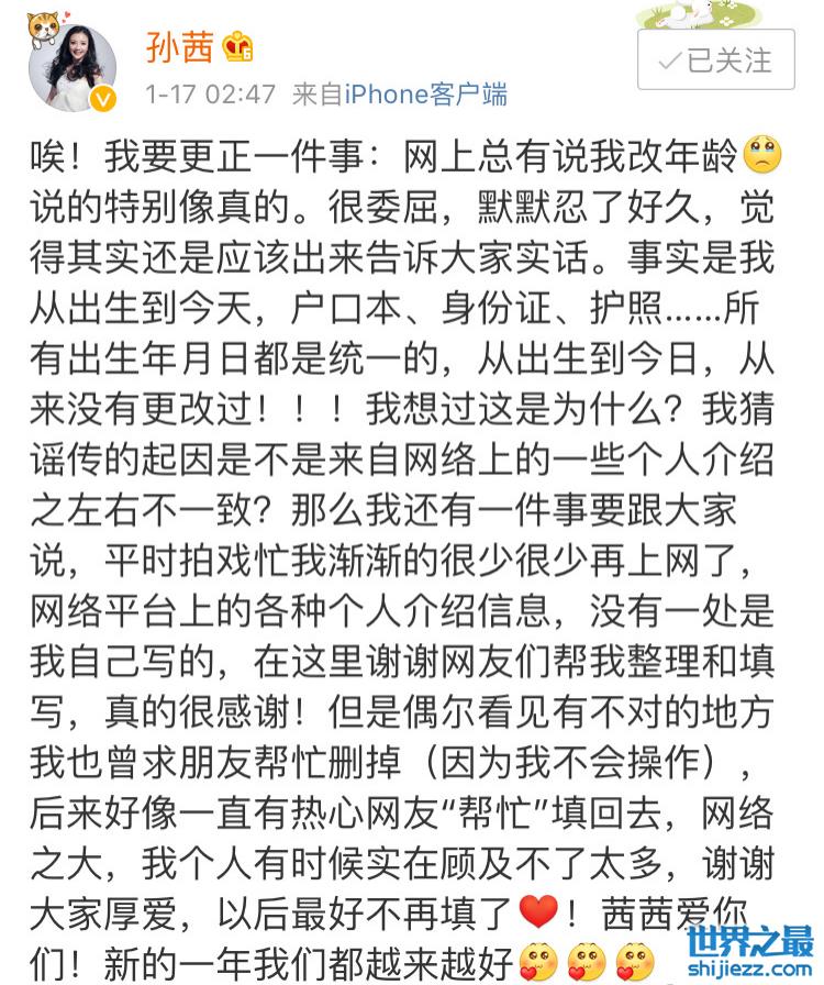 当时节目播出时孙茜被网友谩骂,她造假年龄的问题又被提出来,这次孙茜终于正面回应了年龄问题,声明自己的年龄从来没改过,所有证件上的年龄都是统一的,而网络上的介绍信息,都是网友填写的。