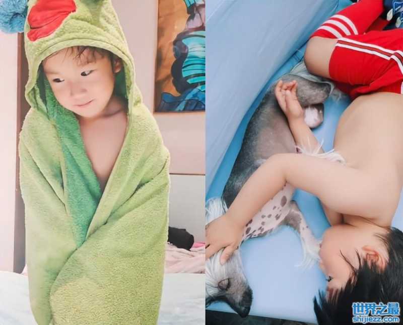 冉莹颖小儿子冉明羲搞怪十足,刚洗完澡的他发丝还有点湿漉漉,裹着浴巾表情十分娇羞。并且他与小狗一起睡觉的画面也令我们忍俊不禁,小朋友脱光上衣露出圆滚滚的肚皮,胖胖的小手摸着身边的狗狗,而狗狗也十分配合的闭着眼睛,画面有爱有趣。