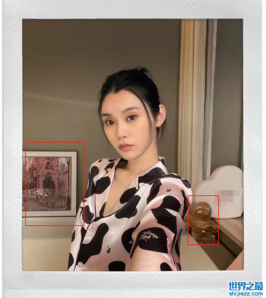 画面中奚梦瑶身穿奶牛纹睡衣十分可爱,肩膀处隐约露出的锁骨朦胧性感。奚梦瑶身后房间布置简约奢华,柜子上的画作精致充满文艺范,角落里的饼干人玩偶表情搞怪可爱,与她这身奶牛衣睡衣非常搭配。
