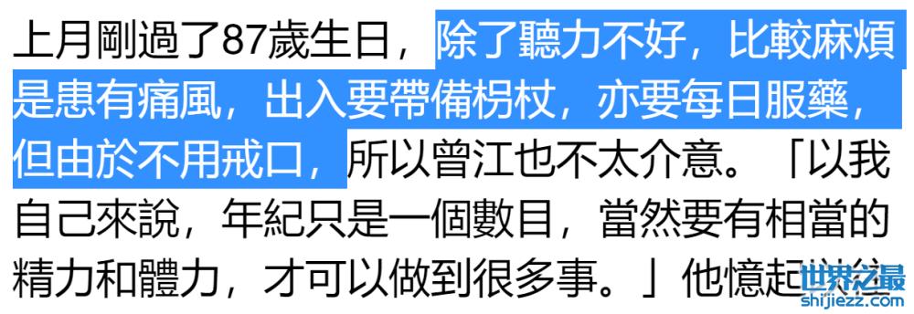 曾江早就到了退休的年纪,不过他非常热爱拍戏,一直都有接戏拍。 不过,前段时间,曾江接受采访时曾表示,自己身体不好,患有痛风,身听力也有缺陷,但是港片处于艰难时期,他虽然年纪大了,但是也想出一份力,每天拄拐杖出门,准时吃药,还好不用忌口。