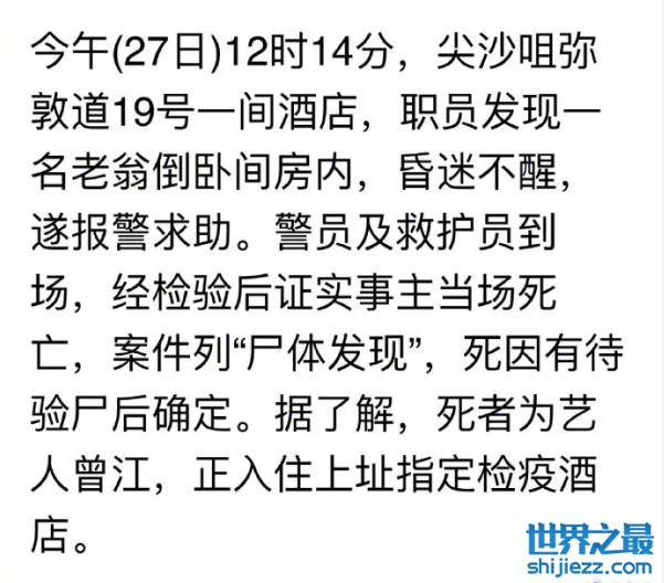 4月27日,香港演员曾江去世。据港媒报道,曾江在香港尖沙咀弥敦道19号一间酒店,发现时已昏迷不醒,经检验后确定死亡。