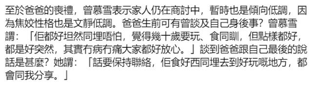 另外,曾慕雪还公开与父亲生前的最后通话内容,直言要经常联系,曾江也会把吃到的美食及去过的好玩地方告诉女儿,看得出曾慕雪虽然是曾江与前妻邓拱璧所生的女儿,但父女俩的感情不错,也始终保持亲密联系。