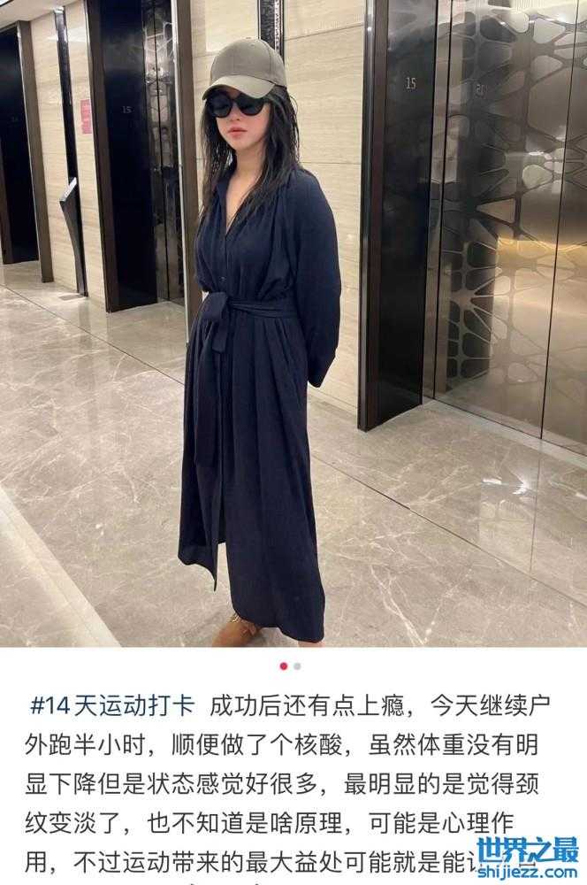 朱珠还给大家分享14天运动打卡的感受,称有点上瘾,虽然体重没有明显下降但状态感觉好很多,最明显的是颈纹变淡了,而运动带来的最大好处就是让人感觉良好。