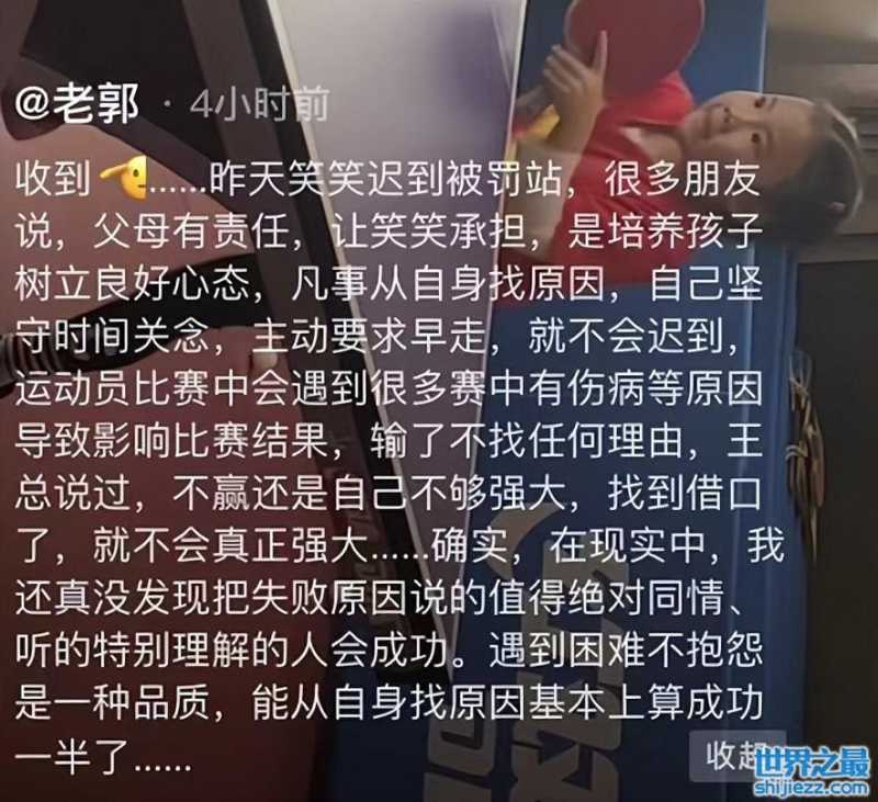 近日,世界冠军王楠的丈夫郭斌在社交媒体上分享了一则女儿因迟到被罚站的视频,由此引发了网友们的热烈讨论。