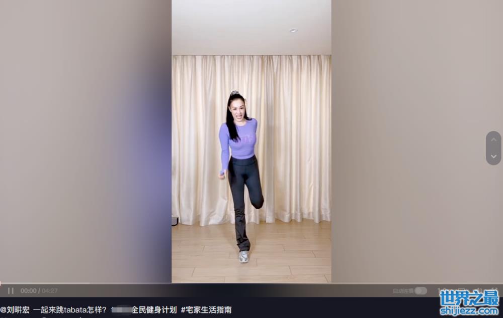 51岁的钟丽缇绑起可爱减龄的马尾造型,淡妆出镜愈发衬出精致的五官。她穿着一件淡紫色紧身衣和黑色运动裤,脚踩一双运动鞋。视频开头她便打足气势,活力满满冲着镜头喊出宅家运动的口号。稍微做热身运动后,她立马动身做健身操,还细心地弄起初学者慢放动作。