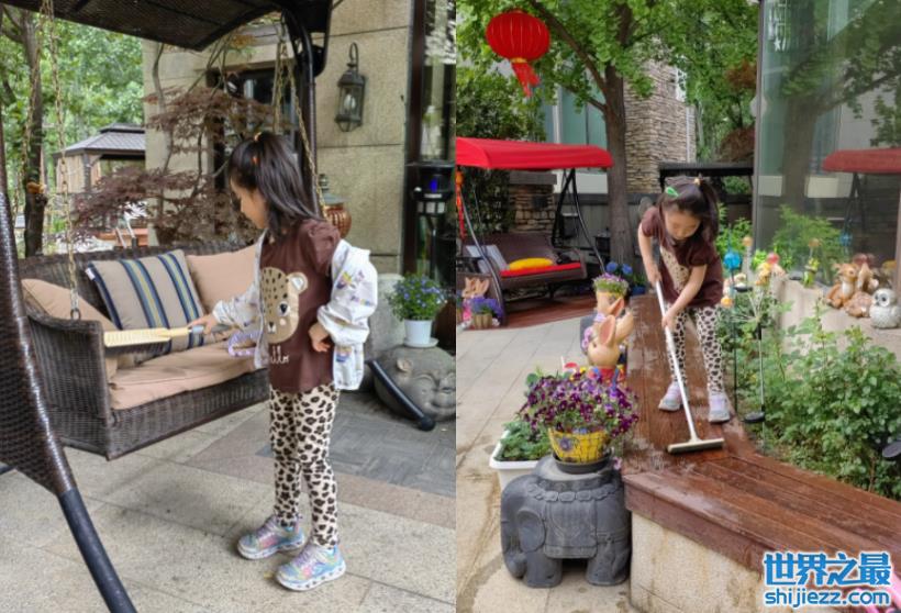 跟爸爸妈妈拍完合照之后,小朋友便认真地打扫起了卫生。叉着腰打扫吊椅的她,显得格外可爱。或许是打扫卫生有些热,小朋友还将外套脱掉了,用拖把擦洗着花坛周围,看上去十分卖力。