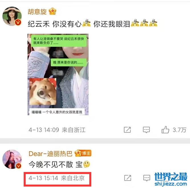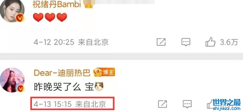因为回复的时间里,热巴在四川成都拍《公诉精英》,而她回复下面的地址却显示的是北京。