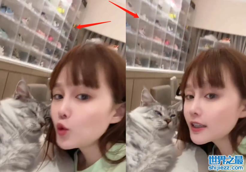 当天球球妆容精致,即便是在家也将自己收拾得很好。在逗猫时,除了球球本人之外,她身后的一墙名牌鞋也十分引人注目。层层垒起的鞋子收纳盒数量很多,里面都摆得满满当当,想必这一墙鞋子,价格也不便宜。