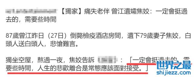 曾江去世,打击最大的无疑是他的第三任太太焦姣,这是她第二次丧夫,不过她已慢慢接受此事,也坚强表示一定会过去的,需要些时间,人生的悲欢离合也是常态应该面对接受,或许也是曾江积极乐观的人生态度,让焦姣勇敢面对今后的生活。