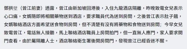 据悉,曾江去世前曾独自一人前往新加坡,当时有不少网友在新加坡偶遇到他,猜测他此行去新加坡是旅游,而后独自返港然后在防疫酒店发生意外。